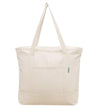 100% cotton canvas large reusable shopping bag with outer pocket and natural zipper closure. The bag measures 22" W x 16.5" H x 5.5" D (56 x 42 x 14 cm). Multi-use, stylish, great for grocery shopping and outdoor activities like picnics, boating, beach and more. Sustainable reusable product eliminates waste from plastic bags.